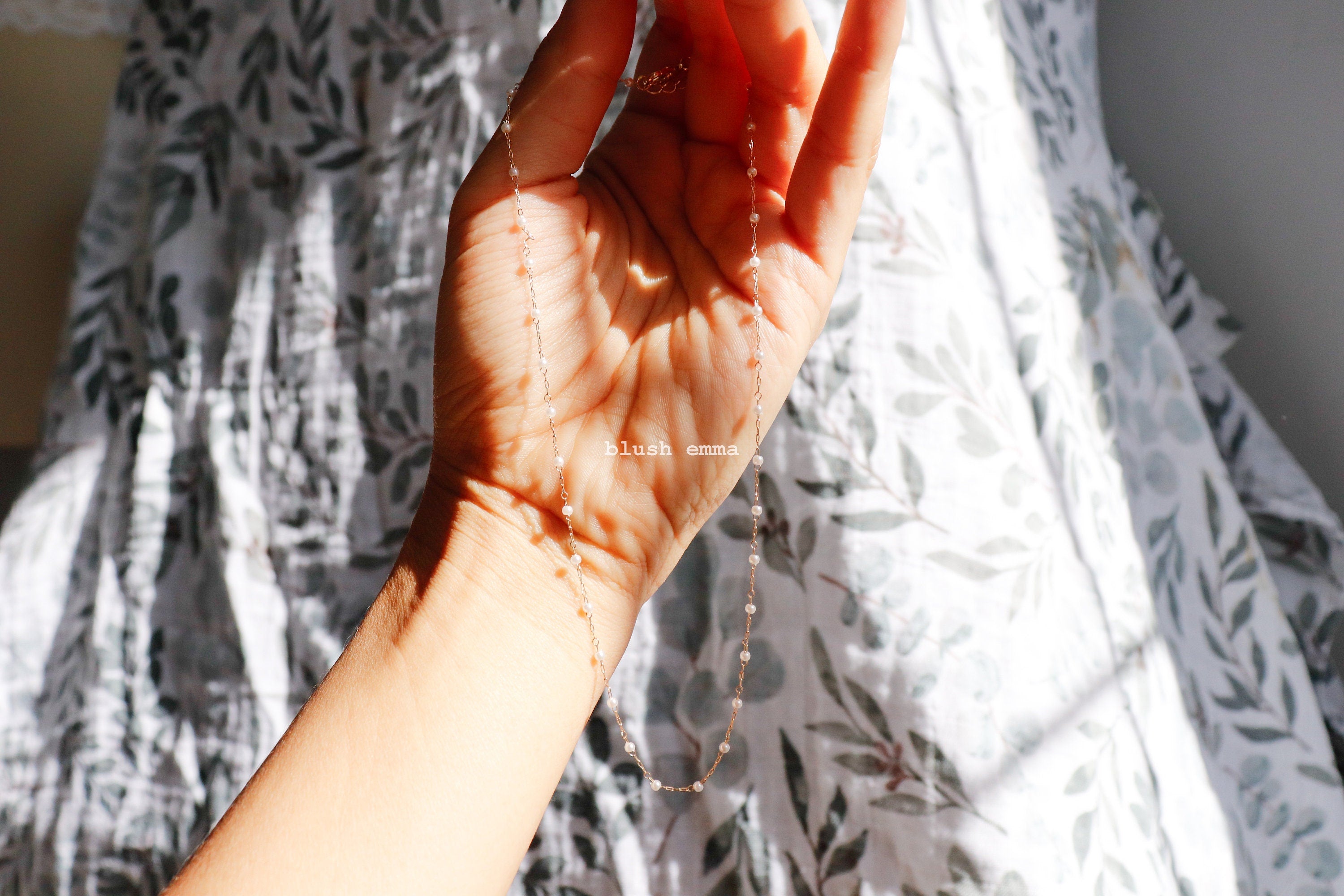 Blushemma Beautiful Flowy 1mm Micro Faux Pearl Beaded Necklace. Spaced beaded necklace with gold clasp, perfect by itself or to layer.